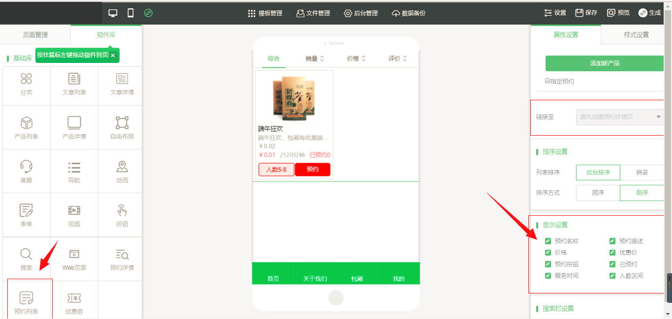 8.在小程序编辑器中拖入“预约列表”插件,会显示除在后台添加的预约产品列表,在属性设置中我们可以进行一些“排序设置”、“显示设置”和“搜索栏设置”等,在“样式设置”中同样也有一些设置项,比如“文字设置”就可以改变页面中的文字颜色,字体等内容,(注意的是要将该列表链接至含有“预约详情”的页面),如图所示: